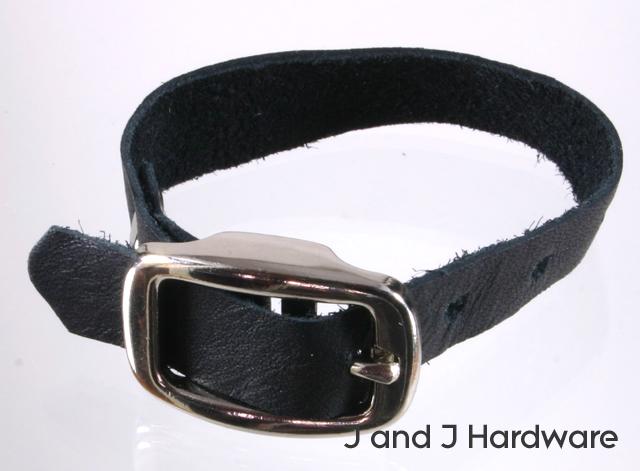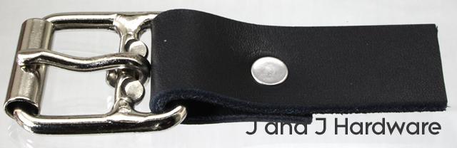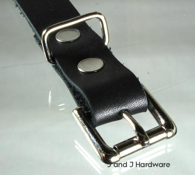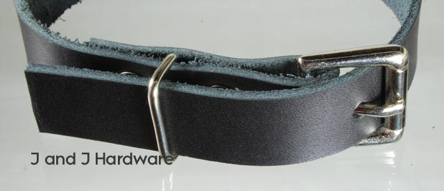 You will probably see this style buckle on things like belts and dog collars more than any other. This is the work-horse of the leather industry. They require some type of keeper to control the excess material from flapping around. Here you see one of our nickel plated wire belt keepers on this example. Very simple to install, all that is required is a hole for the center of the buckle, a couple more holes to insert the rivets to hold it and the keeper in place, and you're done.