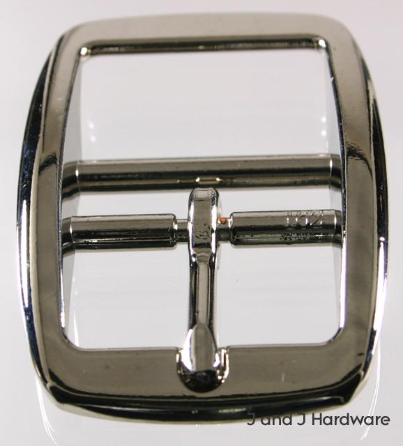 If you take the tongue out of the buckle above and replace it with a special tongue with a hole in it, you have this: A true roller locking center bar buckle (which we offer in nickel plated and shiny black).