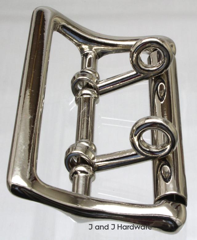 This is a variant of the heel bar roller buckle above, except that, obviously, it has two tongues. These buckles are used almost exclusively in heavy-weight leather applications. They are ideal for weightlifting belts, horse tack, and extra heavy straps. They come in sizes up to 4 inches but only as small as the 2 inch version pictured here.